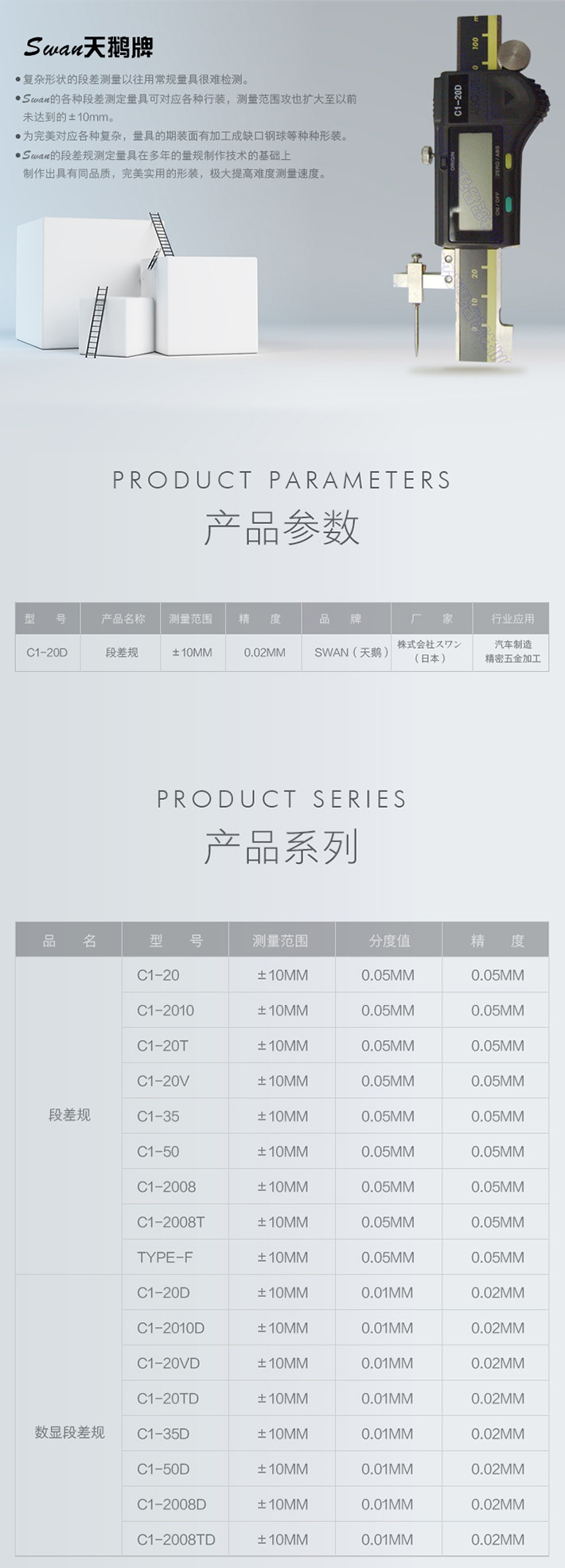 中山川井貿(mào)易有限公司現(xiàn)貨供應(yīng)日本天鵝牌SWAN段差規(guī)、球規(guī)、塞尺、墊片,游標(biāo)卡尺。現(xiàn)貨銷售C1-20段差規(guī),C1-20D數(shù)顯段差尺,C1-20D數(shù)顯面差尺,C1-20D數(shù)顯卡尺。歡迎垂詢,電話:0760-85338100,傳真:0760-85338185,郵箱:sales-ec@zskawai.com,QQ:1521225565