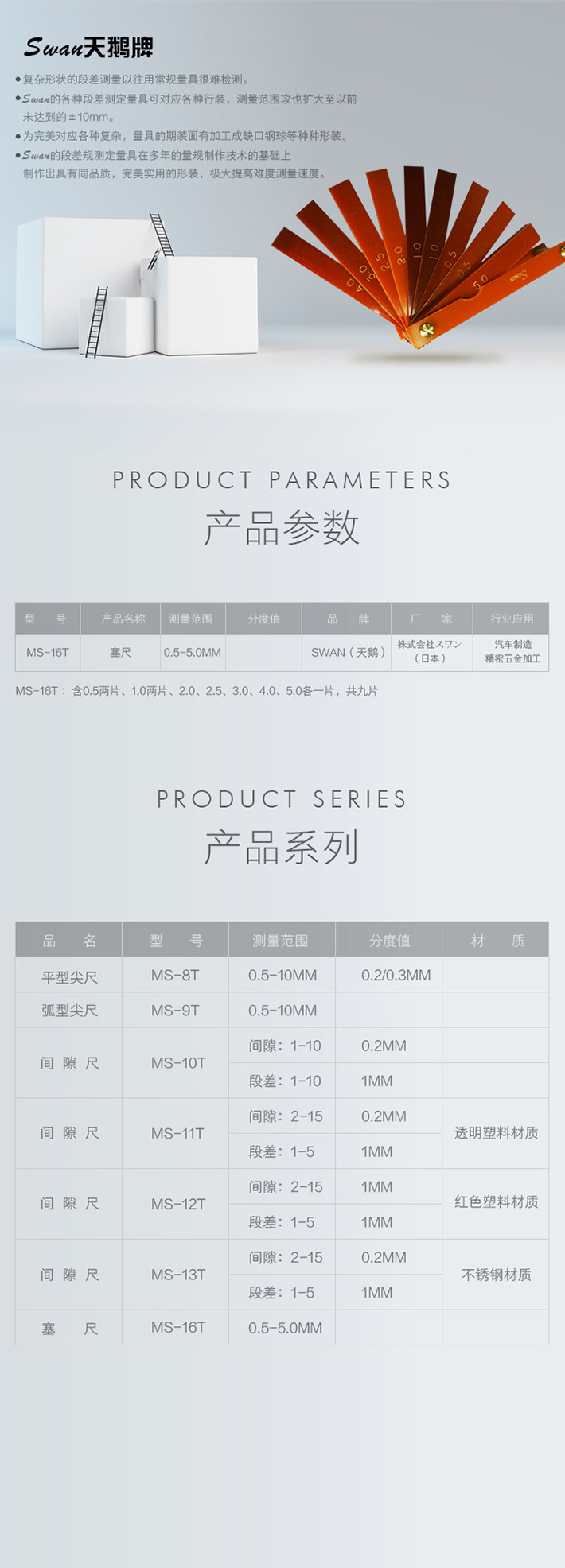 中山川井貿(mào)易有限公司現(xiàn)貨供應(yīng)日本天鵝牌SWAN段差規(guī)、球規(guī)、塞尺、墊片。銷(xiāo)售MS-16T塑料塞尺,MS-16T塑料塞規(guī),MS-16T塑料量尺。歡迎垂詢,電話:0760-85338100,傳真:0760-85338185,郵箱:sales11@zskawai.com,QQ:1521225565