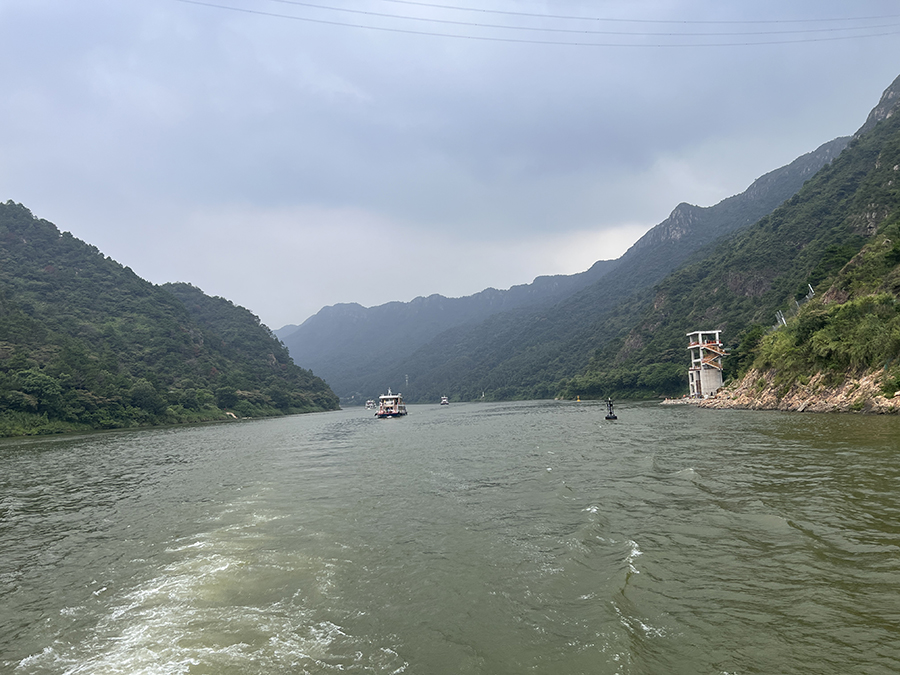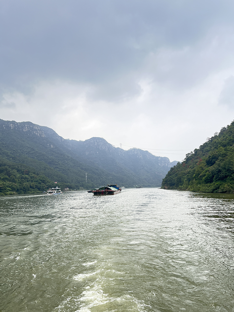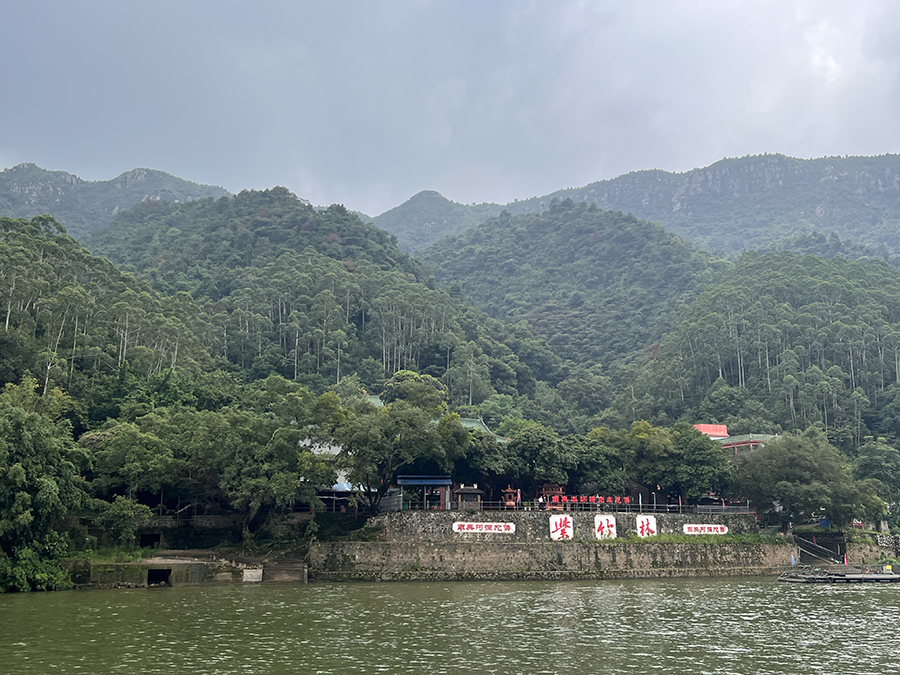 在碼頭上船,沿著小北江溯流而上,雖然無長江三峽"兩岸青山相對出"的險要,卻勝在山清水碧,滿眼都是翠綠愜意。
